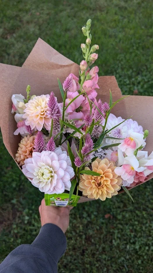 Wrapped bouquets are $25 each. Cash drop box is on the cart, or e-transfer to brantblooms@gmail.com